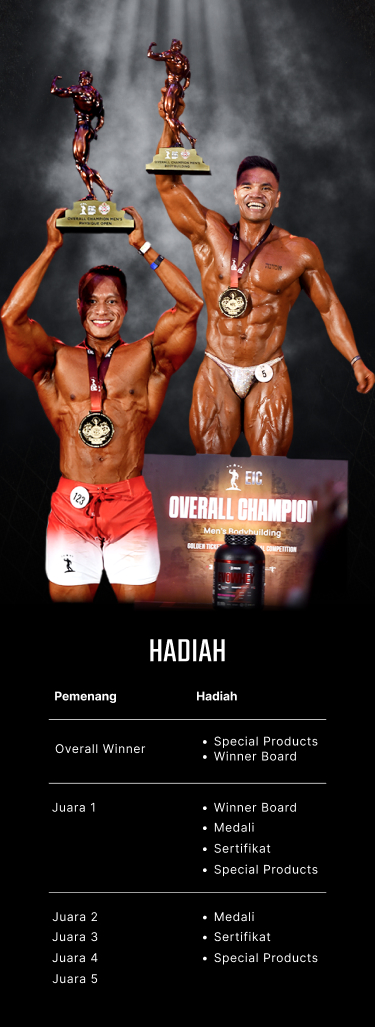Overall champion (Men's Physique Open Class, Men's Classic Physique, Men's Bodybuilding) akan berhak mendapatkan 3 golden ticket/sponsor pertandingan international berikutnya, winner board dan juga special products.